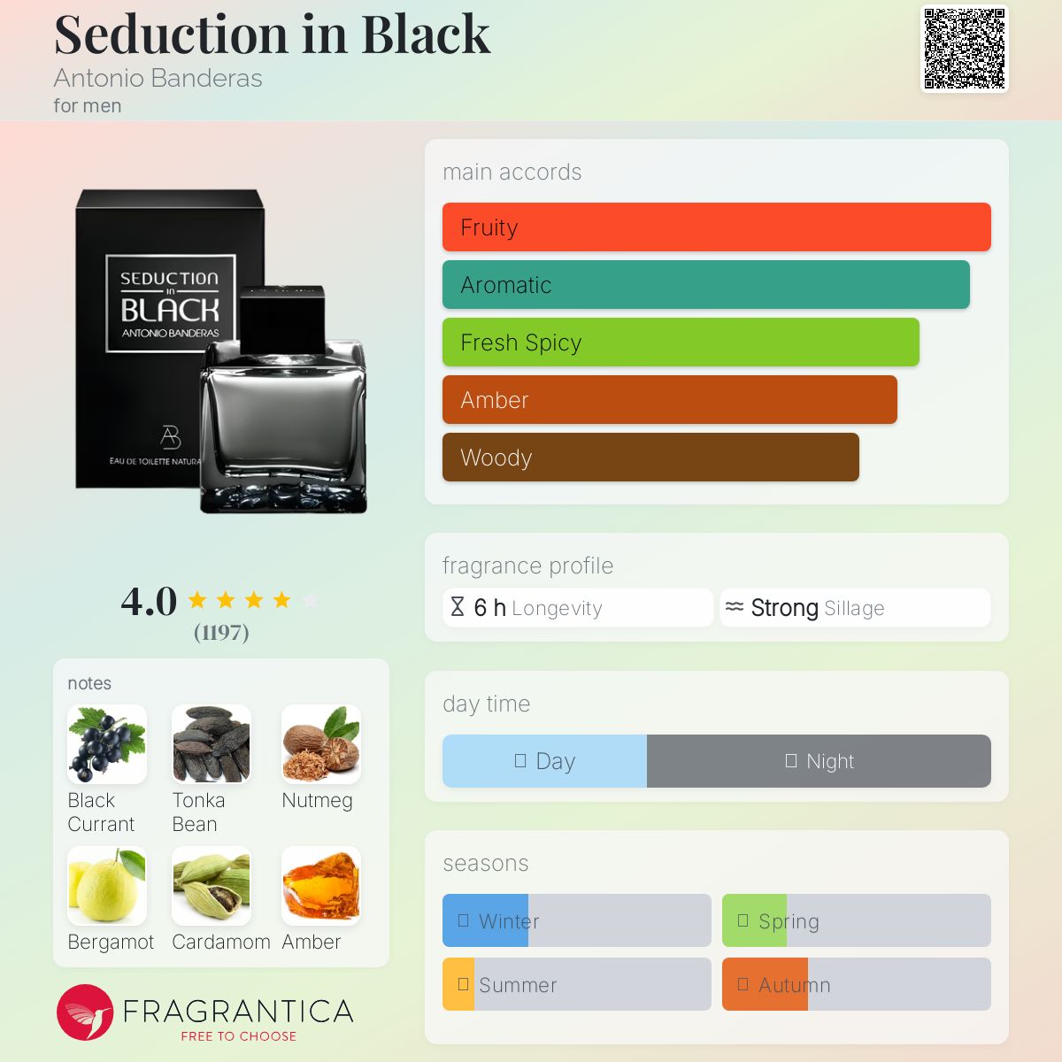 Seduction in Black by Antonio Banderas is a Amber Spicy fragrance for men. Seduction in Black was launched in 2009. The nose behind this fragrance is Olivier Cresp. Top notes are Black Currant and Bergamot; middle notes are Nutmeg, Cardamom and Coriander; base notes are Tonka Bean, Amber, Musk and Virginia Cedar