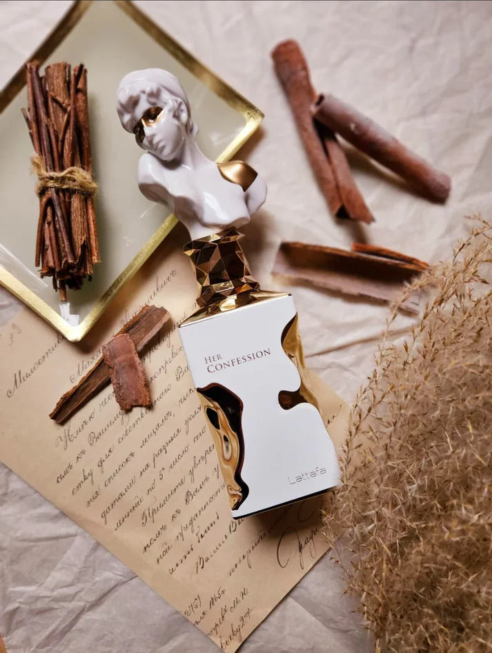 Her Confession by Lattafa Perfumes is a fragrance for women. This is a new fragrance. Her Confession was launched in 2024. Top notes are Mystikal and Cinnamon; middle notes are Tuberose, Jasmine, Incense and Mahonial; base notes are Vanilla, Tonka and Musk.