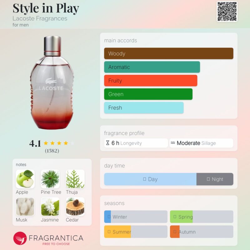 Style in Play by Lacoste Fragrances is a Woody Floral Musk fragrance for men. Style in Play was launched in 2004. The nose behind this fragrance is Annick Menardo. Top notes are Green Apple and Thuja; middle notes are Pine Tree, Jasmine and Cedar; base notes are White Musk, Vetiver and Patchouli.