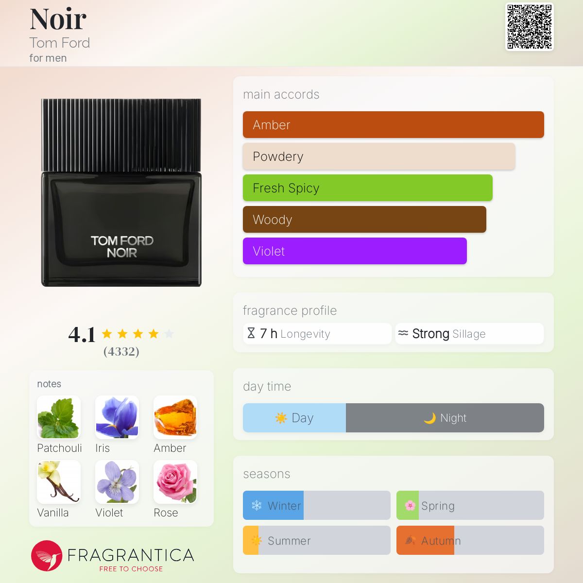 Noir by Tom Ford is a Oriental Woody fragrance for men. Noir was launched in 2012. The nose behind this fragrance is Olivier Gillotin. Top notes are Violet, Pink Pepper, Caraway, Bergamot and Verbena; middle notes are Tuscan Iris, Bulgarian Rose, Black Pepper, Nutmeg, Geranium and Clary Sage; base notes are Indonesian Patchouli Leaf, Amber, Vanilla, Leather, Civet, Opoponax, Benzoin, Vetiver and Styrax.