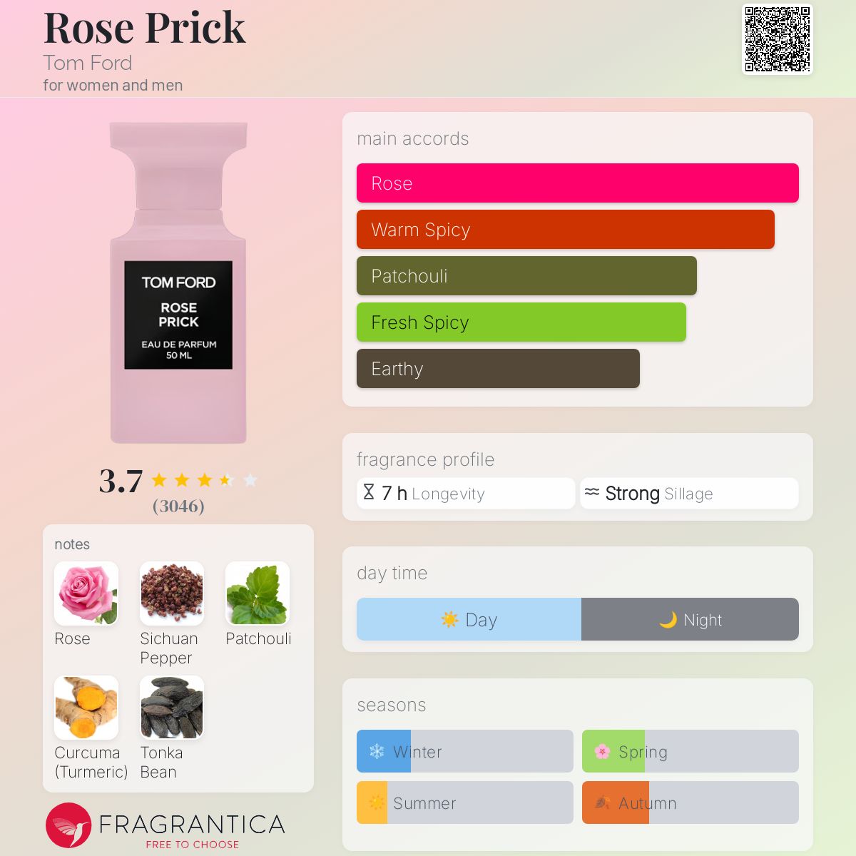 Rose Prick by Tom Ford is a Chypre Floral fragrance for women and men. Rose Prick was launched in 2020. The nose behind this fragrance is Guillaume Flavigny. Top notes are Sichuan Pepper and Turmeric; middle notes are May Rose, Bulgarian Rose and Turkish Rose; base notes are Patchouli and Tonka Bean.
